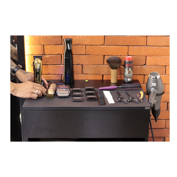 A Bancada para Barbearia T1 Compacta foi projetada para oferecer máxima segurança e praticidade. Ela inclui um tapete emborrachado fundido diretamente na bancada, proporcionando apoio firme para suas máquinas e tesouras, evitando deslizamentos e danos. Além disso, a bancada conta com 5 tomadas embutidas, garantindo que os fios fiquem organizados e fora do caminho, e 2 tomadas laterais, ideais para secador e celular. A instalação é simples e rápida, já que a bancada chega pronta para uso, basta conectá-la à tomada.